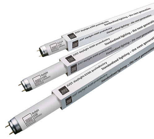 The JUST daylight 6500 proIndustry has a minimal chromaticity error of 0.003° (x, y10°), a high color rendering index (CRI) of Ra ≥ 98 at a correlated color temperature (CCT) of 6500 Kelvin, and very good metamerism properties with a Quality Class to CIE 51.2 of BC or better. The new fluorescent lamp from JUST is available in three lengths with wattages of 18, 36 and 58 W, and is shipped with a test record confirming the quality of the light and compliance with the standards.