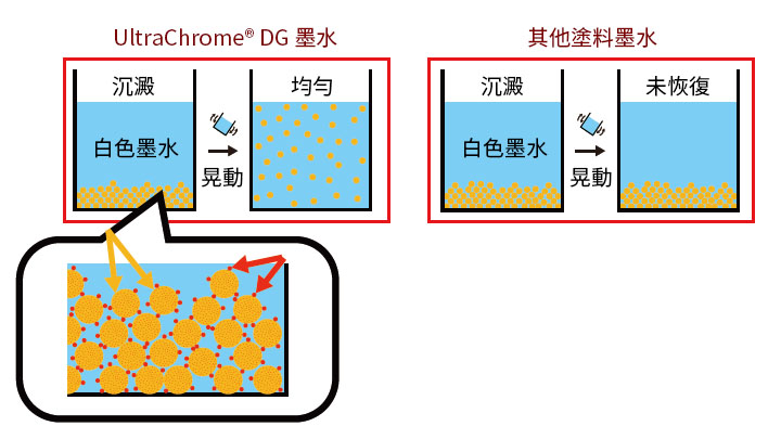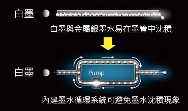 嶄新設計的白色墨水 由於普通白色墨水色料容易沉澱凝結,只能使用搖動墨水匣的方式緩解,對於放置時間過長的白色墨水,搖動墨水匣就不會有什麼作用。