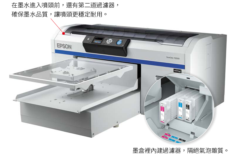 SC-F2000 在墨水過濾系統下足了功夫,除了在每個墨盒裡內建過濾器,更在墨水進入噴頭前,增加第二道防線,有效的隔絕了氣泡與雜質,除了確保墨水品質,更大幅提降低塞噴頭的機率,減少噴頭更換與維護成本。
