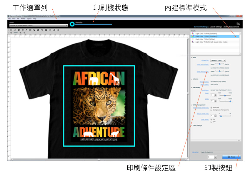 1. 搭配容易使用的印製軟體 Garment Creator,操作介面簡單