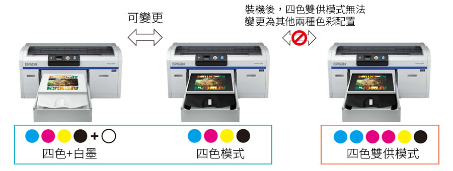 - CCMMYK 四色雙供模式,適用於印製白T,支援更高產能