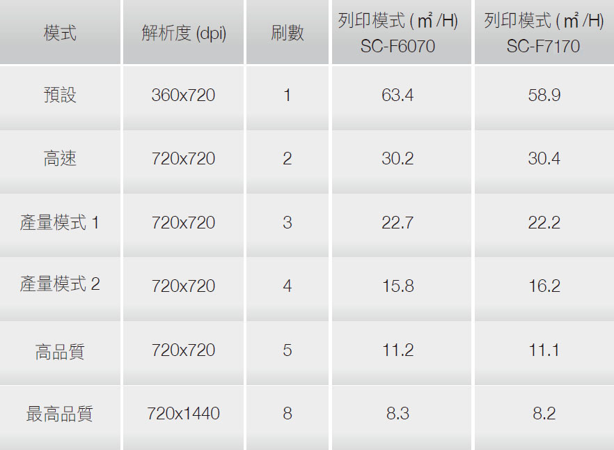 SC-F 系列除列印效果優於一般之外,輸出速度更優於同等級產品,擁有高產能。SC-F6070 最高輸出可達每小時63.4 平方公尺。