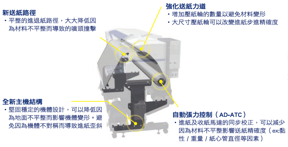 採用最新穩定且平行的收送紙機構,可以避免材料歪斜以及皺褶,大大降低噴頭撞擊機率。