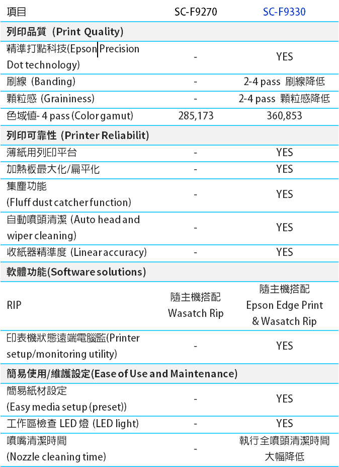 SC-SC-F9330 新一代Epson 64吋熱昇華紡織輸出機,配置原廠特黑墨,經實驗證實,特黑墨的高密度成分,可以讓輸出表現更好更省墨。SC-F9330最高速可達108.6m2/h,除了印刷速度提升外,更新增了精細的Pass數的選項,可供您在省墨與確保品質之間,取得最佳平衡點。