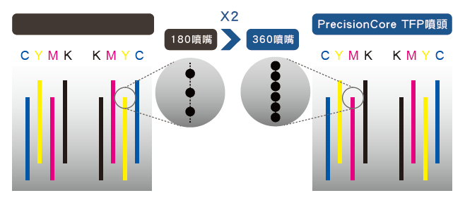 SC-F 系列 採用最新 PrecisionCore 精點微噴 TFP 噴頭,功能超越市面上一般壓電式噴頭,每一色系皆擁有他牌 2 倍的噴嘴數,可創造出每色 360 x 2 共 720 噴嘴。當使用較少刷數列印時,可媲美市面上噴頭的多刷數列印之效果,讓使用者使用較少刷數即可得到高列印品質。加上