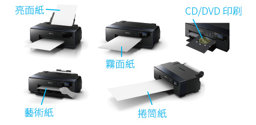 適用多種紙材輸出,讓 SC-P607 成為專業攝影師不可或缺的利器。支援光面相紙、霧面紙、藝術紙、捲筒紙,以及 CD 和 DVD 印刷,全都能精準且輕鬆地透過前方進紙裝置置入紙材。最大紙材厚度可達1.3mm。