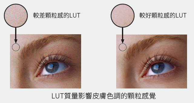 一般在人像或商業攝影的皮膚色調中,顆粒感尤其顯著。LUT 技術優化每個圖元中色彩的均勻分佈,有效消除了顆粒感。