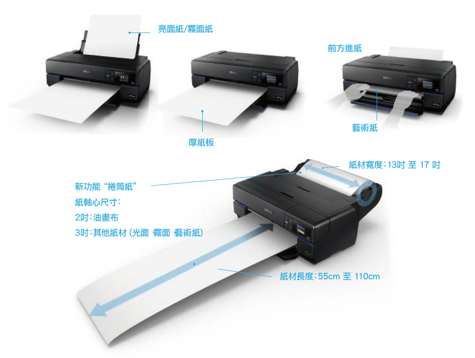 支援捲筒紙以及多種紙材輸出,讓 SC-P807 成為專業平面設計師以及攝影師不可或缺的利器。適用光面相紙、霧面紙、藝術紙、捲筒紙等各式紙材,最大紙材厚度可達1.3mm,可依使用者需求,選擇適合的紙材印製稿件,不會因為紙材長度侷限而只能屈就拼接列印,讓您的創意完整呈現。