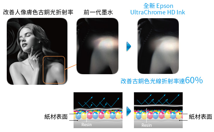 Epson UltraChrome HD 墨水結合了全新的塗層技術,降低不同墨水顏色反光度之間的差異,有效隔絕光線反射效應,改善人像膚色古銅光折射率,讓輸出的人像攝影作品更貼近真實膚色表現,大幅提升作品價值。