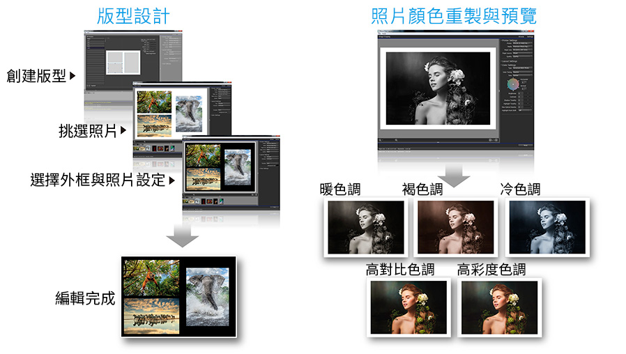 使用者可於網站上免費下載 Epson Print Layout 專業影像編輯軟體,包含版型設計、多張照片拼貼、照片顏色重製、常用紙材設定等強大功能。使用者可以將照片編輯後。調整成自己喜愛的色調,再利用 SC-807 印出,利用照片進行居家布置或桌邊擺設,皆能讓您的攝影作品更加出色。