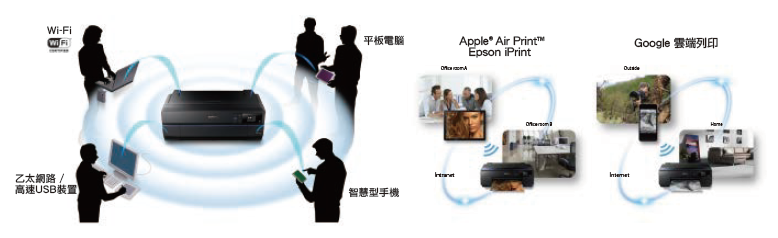 SC-P807 採用最新 Wi-Fi direct 技術、支援智慧型手機、平板電腦無線點對點連接,無須透過 Notebook 或 PC 驅動,即可直接列印照片及文件檔案;同時也支援 iOS AirPrint 以及 Google 雲端