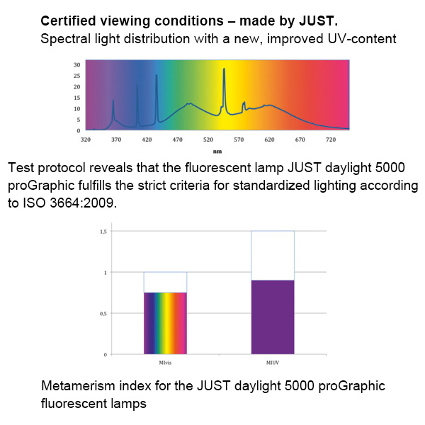 The high quality fluorescent tubes, JUST daylight 5000 proGraphic, create optimum viewing conditions for critical color assessment.