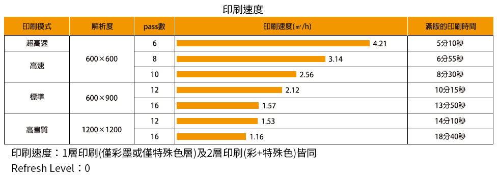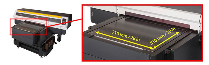 透過交錯排列的6顆印刷噴頭,追求高速化印刷,實現頂級的印刷速度。近似的印刷條件下,約為敝公司過去機種的1.8倍、約為其他公司同級機種的2.4倍,能以高速印刷支援顧客的生產作業。此外,印刷範圍擴大為710mm×510mm(28inch×20inch),可應用於網版印刷上經常使用的菊半裁版尺寸(636mm×469mm)。