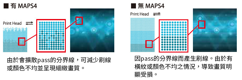 一般來說,pass 的分界線為直線,若有少許偏移時則會出現橫條紋,並導致產生刷線或顏色不均的情況。「MAPS4」(Mimaki Advanced Pass System 4)可擴散 pass 的邊端,將分界線以漸層方式呈現,進而減少刷線或顏色不均的產生,並呈現細緻完美的印刷效果。