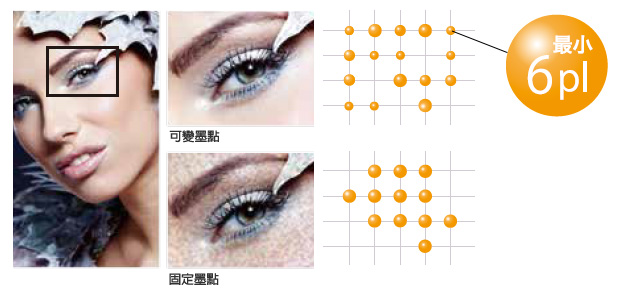 從最小 6pl 至最大 30pl 的墨點大小中,配合所選擇的印刷模式,自動從3種尺寸類型中選擇最適合的尺寸並印刷。此外,CMYK 與特殊色能以不同的墨點組合同時印刷。例如 CMYK 以小墨點進行細緻的印刷,而為了提高遮蔽性,特殊色的白色則以大墨點進行高濃度印刷,如此即可配合用途進行最合適的印刷作業。