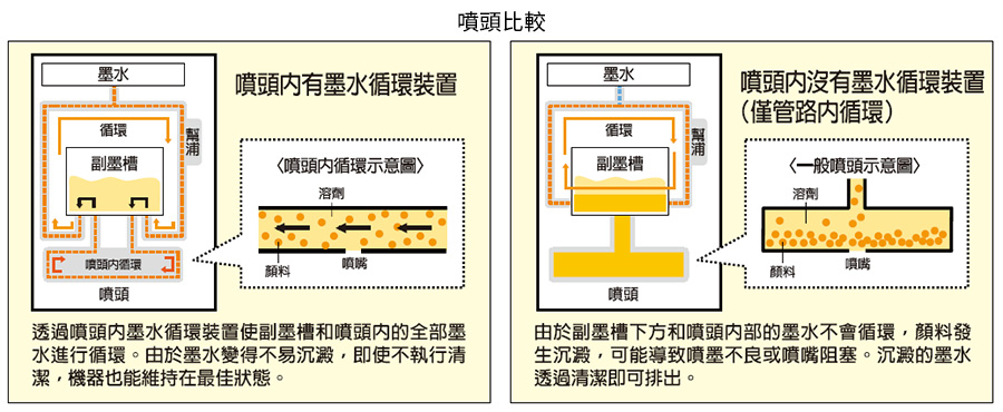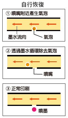 透過『噴頭』所搭載的『循環』功能,可不斷地循環墨水進而防止顏料沈殿,能夠噴印出穩定的墨水。此外,氣泡是造成噴嘴阻塞的原因,透過循環墨水除去氣泡,可恢復因氣泡而產生的噴嘴阻塞,以達到「自行恢復」。排出顏料沉澱的墨水,即可減少為了恢復噴嘴阻塞所需的清潔次數,亦有助於縮減營運成本。