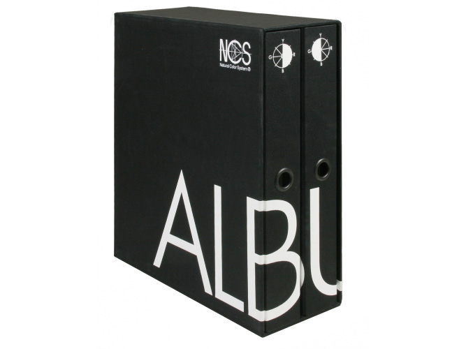 NCS Album 分為兩部分。第一部分的文件夾裡包括各種灰色,以及從Y到 R90B 的各種顏色。第二部分的文件夾包括從 B 延伸到 G90Y 的各種顏色。NCS Album 裡的 1950 個顏色皆為 A9 規格的活動色票,全部色票都可單獨訂購補充,還附送一個實用的存放盒。在密實的插袋裡面,每種顏色都有三張色票放置其中。白色啞光銅版紙為各種顏色提供良好的背景襯托。NCS Album 裡還包括色窗,用來更好地進行顏色評估和選擇。在 B-G90Y 色票集背後還有一頁顏色組合指南,説明進行有關近似色與顏色搭配的工作。