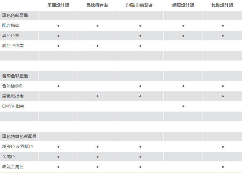 - 符合PANTONE MATCHING SYSTEM®(PMS) 的印刷專色。