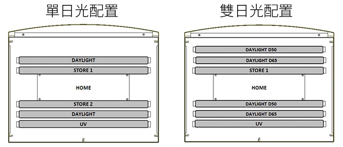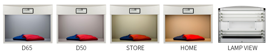 - 專用的 D50 和 D65 光源適用於印刷和工業應用。還包括白熾光 (A)、UV 和螢光燈。