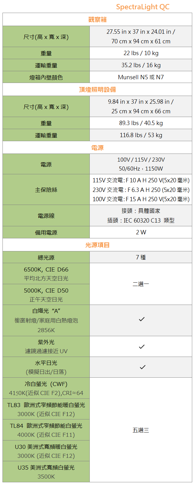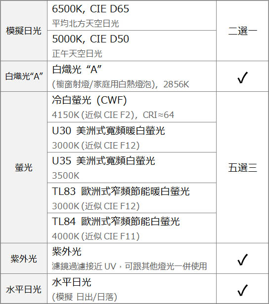 SpectraLight QC 的七種光源